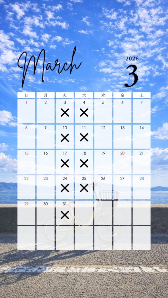 3月はすべての週において火曜日・水曜日にお休みをいただきます。
