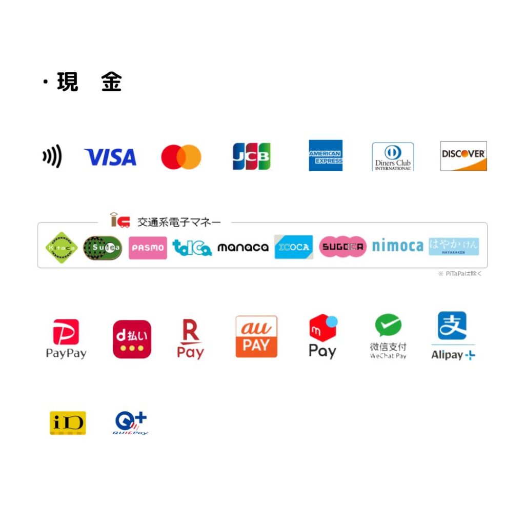 店舗でのお支払いは上記の通りです。店舗外でのお支払いは「現金のみ」です。