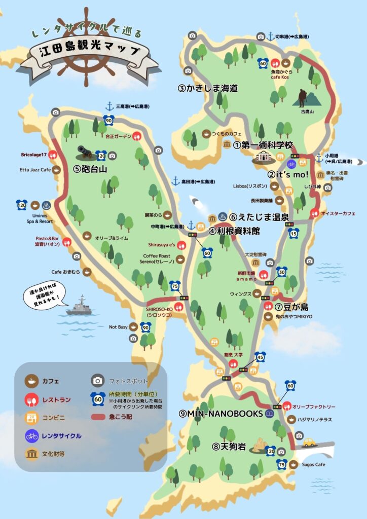 江田島は広島県で一番大きな島。新幹線広島駅から約1時間で行くことができるアクセスの良さが魅力的。移動手段は自転車がおすすめ!