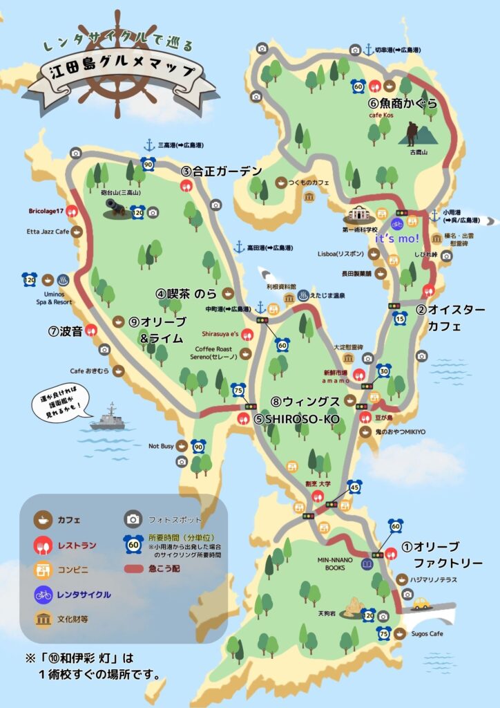 江田島は広島県で一番大きな島。新幹線広島駅から約1時間で行くことができるアクセスの良さが魅力的。移動は自転車がおすすめ!